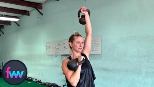 Press one of the weights over your head. I prefer to start staggered like this... it makes finding your rep rythm a lot easier.